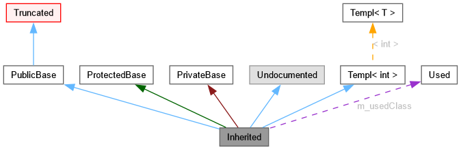 • A purple dashed arrow is used if a class is contained or used by another class. The arrow is labeled with the variable(s) through which the pointed class or struct is accessible.